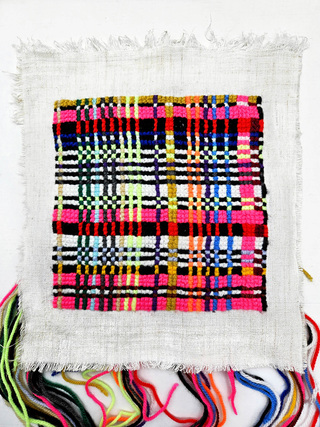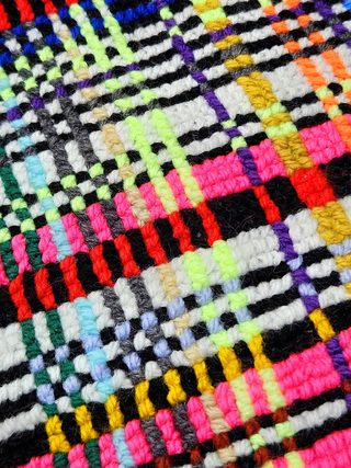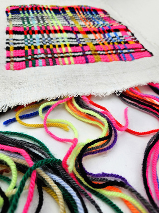At first glance, this work gives a cheerful overall impression with its bright colours, pleasant pattern and playful yarn ends. But nothing is as it seems.