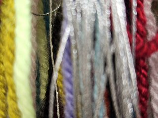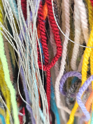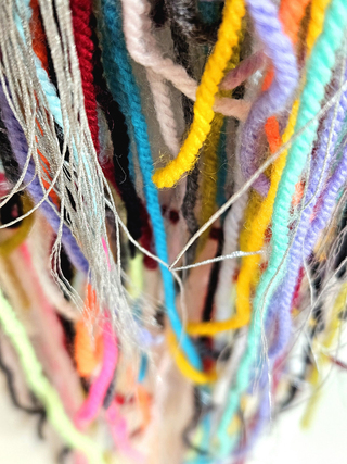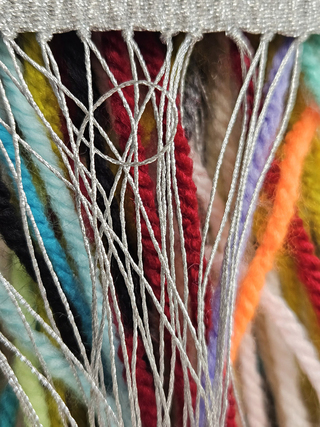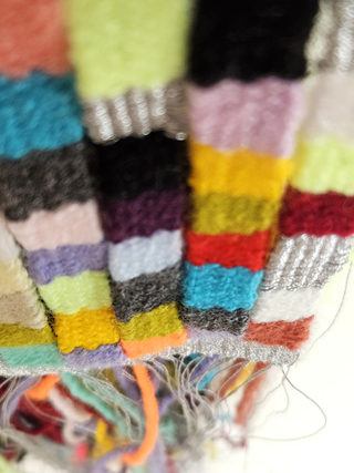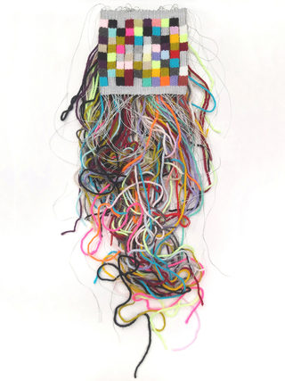 Each letter and each punctuation mark is replaced by a colour; the spaces are silver-coloured and made from the same metallised yarn used for the warp. The loose yarn ends and warp threads constitute an uncontrolled counterpart to the controlled woven surface.