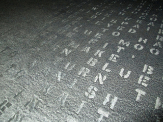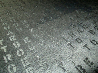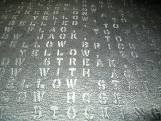 When physically mixing the 3 primary colours, the resulting colour will be grey; thus grey is the only shade of thread used here. The idioms become visible by the use of different stitch directions: vertical for the background and horizontal for the letters.