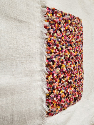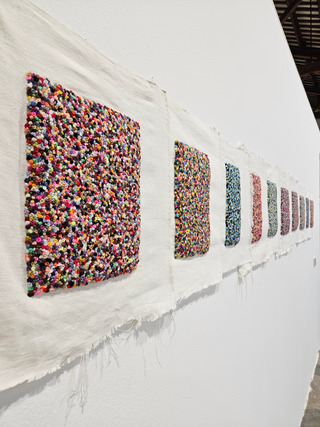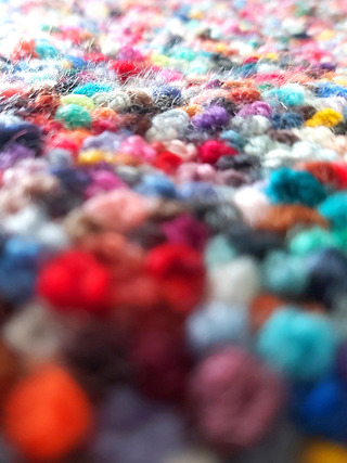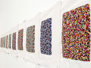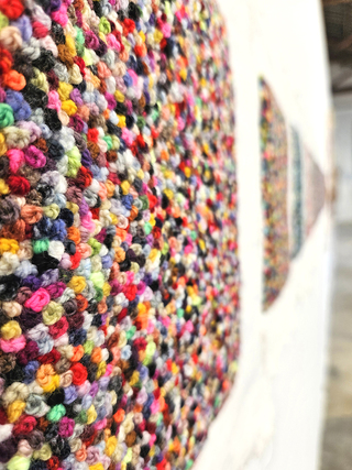For this work, I used a yarn available in 100 different shades, i.e. as many shades as there are years in a century. I assigned each shade a number between 00 and 99 as follows: 00-09: whites, 10-19: purples, 20-29: browns, 30-39: reds, 40-49: oranges, 50-59: yellows, 60-69: greens, 70-79: turquoises, 80-89: blues, 90-99: blacks.